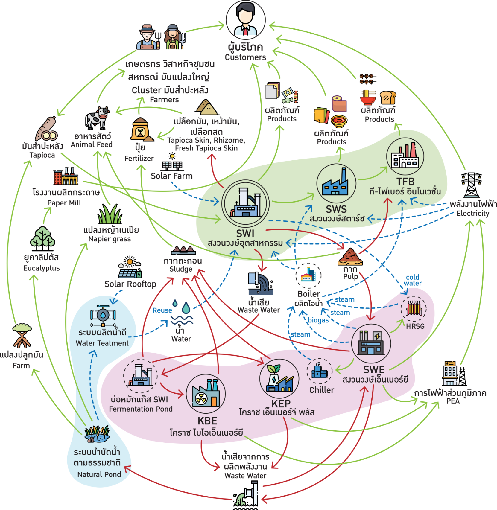 การดำเนินโครงการด้าน sustainability และ community engagement เช่น การฝึกเกษตรกรปลูกมันสำปะหลัง, ระบบรีไซเคิลน้ำ